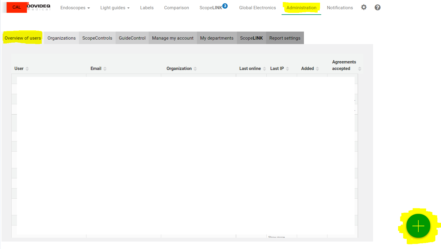 - Click on the "Administration" tab, then the "Overview of users" tab and click on the Green dot with the +