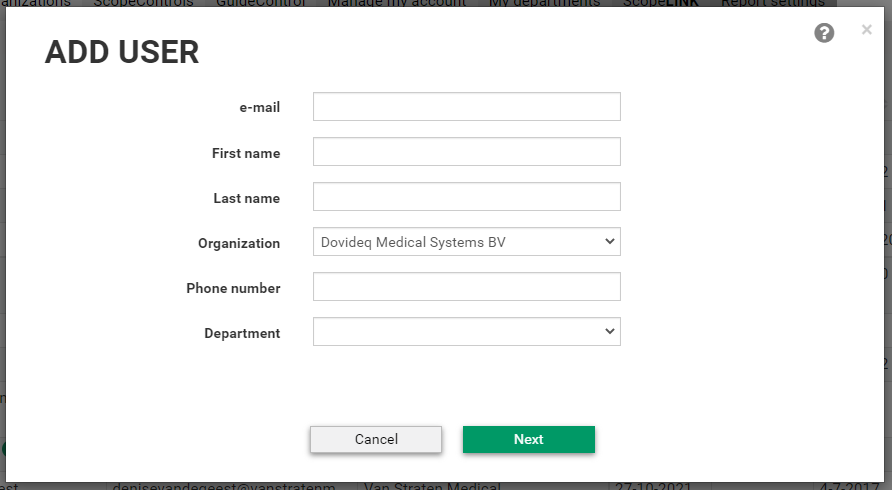 - Add user details and select the organisation + department.